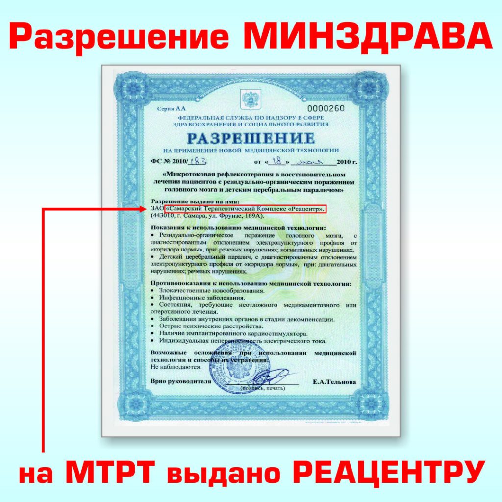 В 2010 году Минздрав РФ выдал РАЗРЕШЕНИЕ на применение Микротоковой рефлексотерапии у детей с задержками развития. Именно по этой причине МТРТ применяется только в наших отделениях.